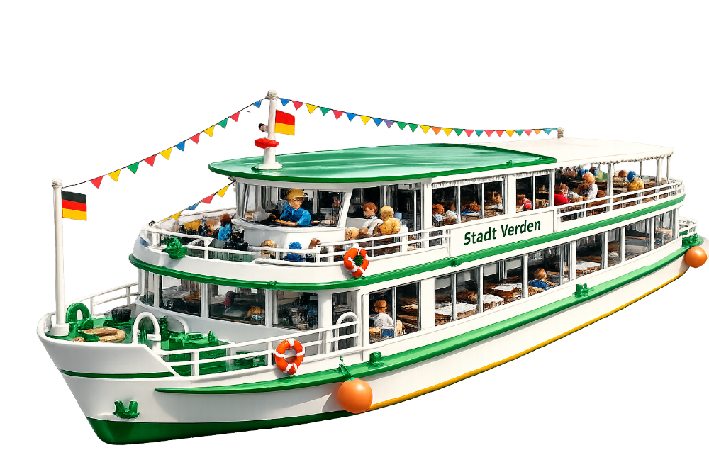 Tanzen auf dem überdachten Freideck der "Stadt Verden" könnte das Highlight für Ihre Feier auf dem Schiff sein, während im großen Salon unten für Sie stilvoll für das Schlemmen vom leckeren Buffet eingedeckt ist.