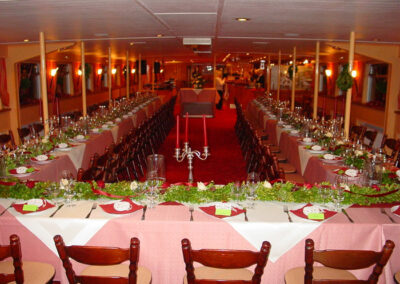 Feiern auf dem Schiff bedeutet für Sie als Gastgeber null Stress. Von der Planung Ihrer Feier an Bord über Buffetvorschläge unterschiedlichster Preisklassen und Ausrichtungen, über die Eindeckung in Ihren Lieblingsfarben bis hin zur Bereitstellung Ihrer Lieblingsgetränke, bieten wir Ihnen ein Rundum-Sorglos-Paket an. Sprechen Sie uns an für ein unverbindliches Angebot für Ihre Feier auf dem Schiff. Bieten Sie Ihren Gästen etwas ganz Besonderes.